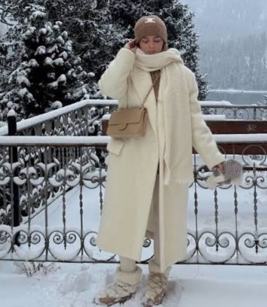 Katmanlı Kış Kombinleri: Bulut beyazı bir palto, altına taş rengi bir triko ve açık gri yün pantolon. Harika! Cloud Dancer, kış aylarında bile ferah ve aydınlık bir siluet oluşturur.